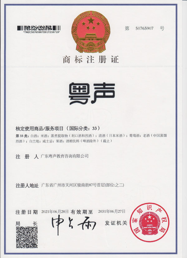 商标注册证--粤声33类