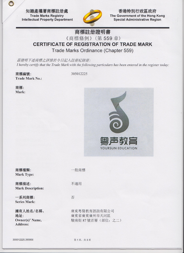 香港商标注册证--粤声教育